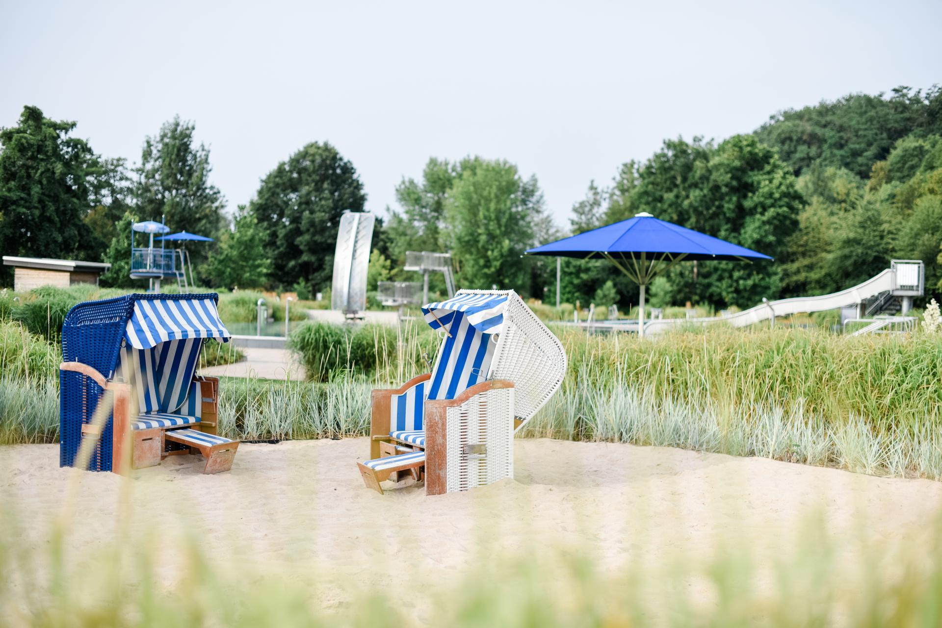 mit Strandkörben, Umkleideboxen, Tischtennisplatten und einem Volleyballfeld